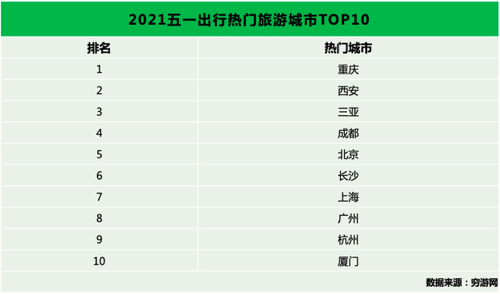 隨着五一假期臨近,國內旅遊熱度持續走高。近日,窮遊網發佈了《2021年五一旅遊趨勢預測報告》。報告顯示,重慶、西安、三亞最受遊客青睞,親子游熱度高漲且消費能力突出,親子游在國內的單次旅行消費較2019年提高了37.8%。