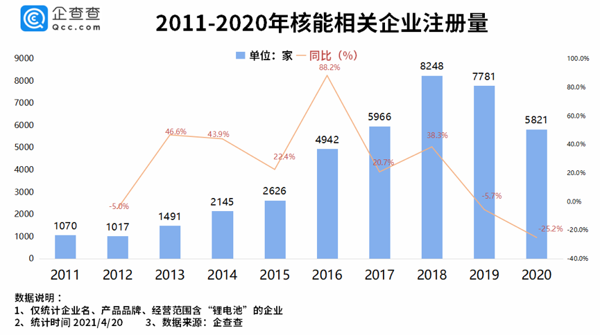 從近十年來鋰電池相關企業年註冊量變化來看,企查查數據顯示,2018年之前均處於逐年上升趨勢,2018年達到最高的8248家,2018-2020年呈逐年下降趨勢,2020年全年新註冊企業5821家,同比下降25.2%。