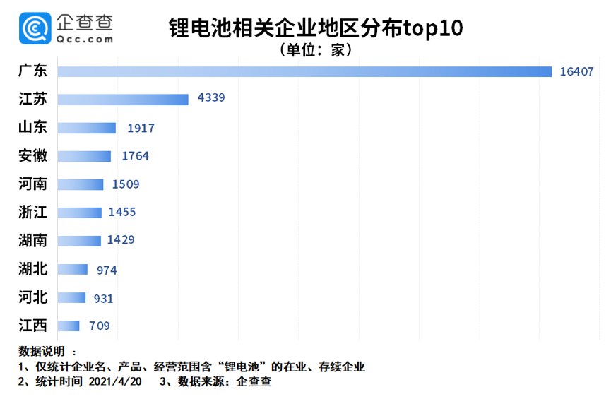 【環球網 記者 陳超】4月19日,鋰電池板塊持續走強,拓邦股份、中礦資源、天際股份、多氟多等多股漲停,豪森股份、億緯鋰能、長信科技等漲逾11%。據企查查數據顯示,目前我國共有3.76萬家鋰電池相關企業,廣東省以1.64萬家企業高居第一,江蘇、山東分列二三名。2020年,鋰電池相關企業註冊量為5821家,同比下降25.2%,今年一季度新註冊1028家,同比下降3.11%。此外,全行業40%的企業註冊資本高於500萬。