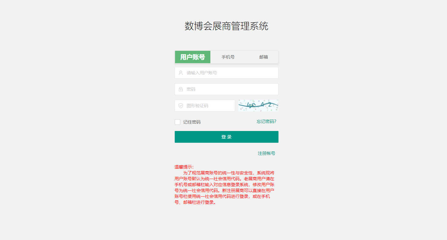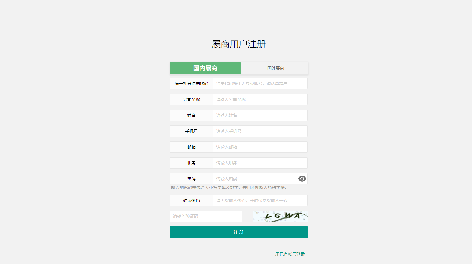 已有賬號請點擊【用已有賬號登錄】,或官網首頁右上角【展商登錄】,展商可選擇用户賬號、手機號、郵箱三種登錄方式登錄,展商登錄界面如下圖所示。