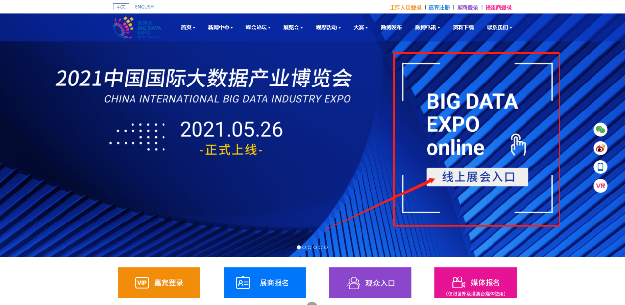 打開數博會官網(https://www.bigdata-expo.cn/),點擊首頁線上展會入口;