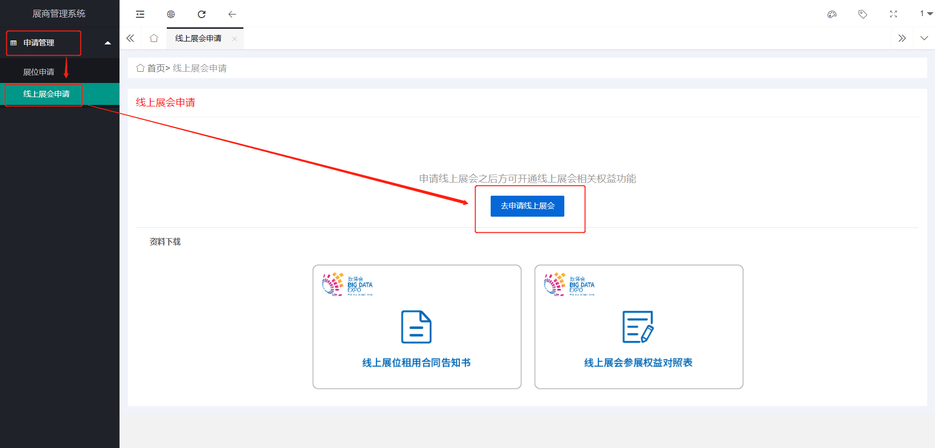 點擊“申請管理>>線上展會申請>>去申請線上展會”申請線上參展。工作人員審核通過後展商即可使用線上展會對應的權益。