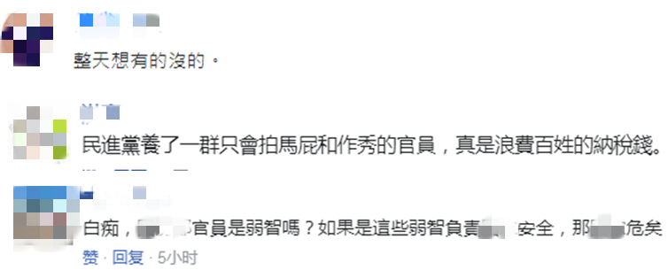 “整天想有的沒的”,也有網友批評稱,“民進黨養了一羣只會拍馬屁和作秀的官員,真是浪費百姓的納税錢。”還有人諷刺稱,如果是這些弱智負責台灣安全,那台灣危矣!