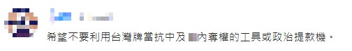 還有網友表示,“希望不要利用台灣牌當抗中及島內奪權的工具或政治提款機。”