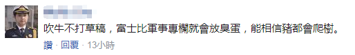 還有網友説:“吹牛不打草稿,《福布斯》軍事專欄就會放臭蛋,能相信豬都會爬樹。”