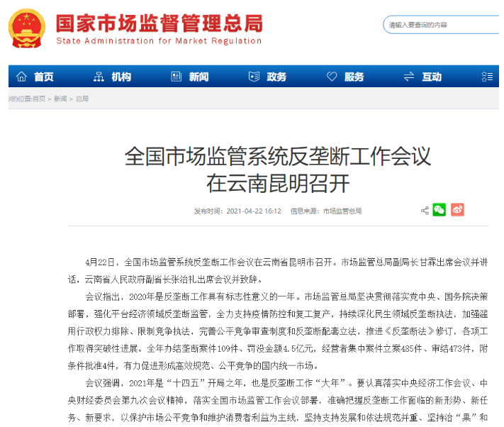 會議指出,2020年是反壟斷工作具有標誌性意義的一年。市場監管總局堅決貫徹落實黨中央、國務院決策部署,強化平台經濟領域反壟斷監管,全力支持疫情防控和復工復產,持續深化民生領域反壟斷執法,加強濫用行政權力排除、限制競爭執法,完善公平競爭審查制度和反壟斷配套立法,推進《反壟斷法》修訂,各項工作取得突破性進展。全年辦結壟斷案件109件、罰沒金額4.5億元,經營者集中案件立案485件、審結473件,附條件批准4件,有力促進形成高效規範、公平競爭的國內統一市場。
