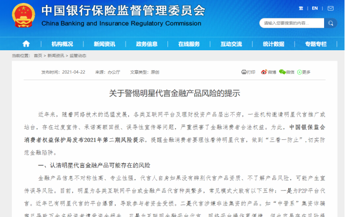 【環球網綜合報道】4月22日,銀保監會發布《關於警惕明星代言金融產品風險的提示》,提醒金融消費者要理性看待明星代言,做到“三看一防止”,切實防範金融陷阱。