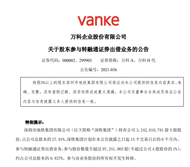 【環球網 記者 徐娜】4月21日晚間,萬科發佈公告稱,收到股東深鐵集團《關於開展轉融通證券出借業務的告知函》,深鐵集團擬在公司披露公告之日起15個交易日後的6個月內,以所持有的不超過97241965股公司A股股份(不超過公司A股股份的1%),約佔公司總股本的0.837%,參與轉融通證券出借業務。