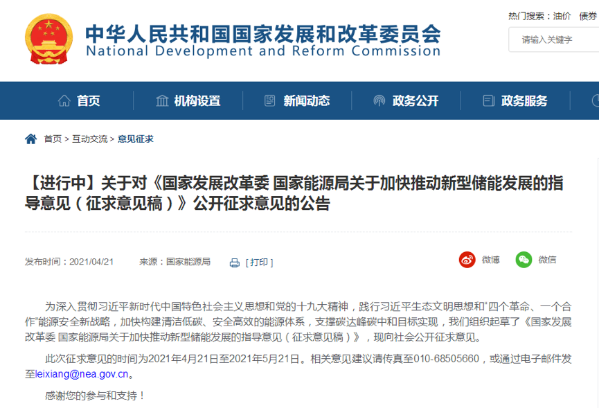 【環球網 記者 陳超】4月21日,環球網財經從國家發改委官網瞭解到,為積極應對氣候變化,努力構建清潔低碳、安全高效能源體系,發改委和能源局組織起草了《國家發展改革委國家能源局關於加快推動新型儲能發展的指導意見(徵求意見稿)》,現向社會公開徵求意見。