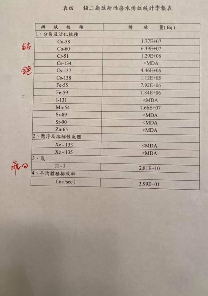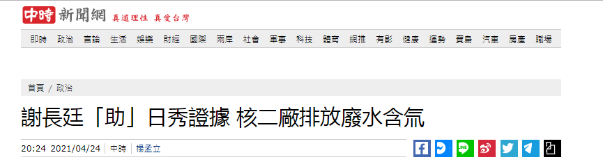 報道稱,謝長廷24日在臉書發佈“核二廠放射性廢水排放統計季報表”等兩份文件,證明核二廠上一季廢水排放內容,不但有“氚”,也有鈷58、鈷60、銫137、銫138等放射物質,“數量微小,但不該存在”。他還聲稱“如果説的不是事實,願意去坐牢”。