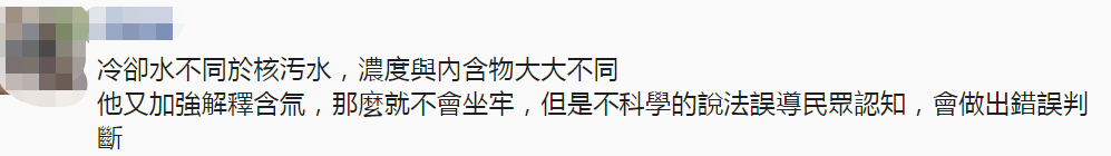 報道稱,對於謝長廷公佈文件試圖證明台灣核電廠的含氚廢水也排入海洋,台灣“原能會”主秘邵耀祖24日表示,全世界核能電廠不可必免皆會排放含放射性廢水,其中主要的核種就是氚,但日本此次擬排放的核污染水為其流經熔燬爐心下的地下水,而台灣排放的為處理過程中的含氚廢水,來源明顯不同,況且台灣排放的含氚廢水遠低於標準。
