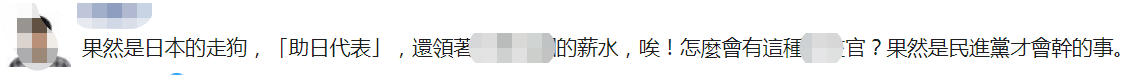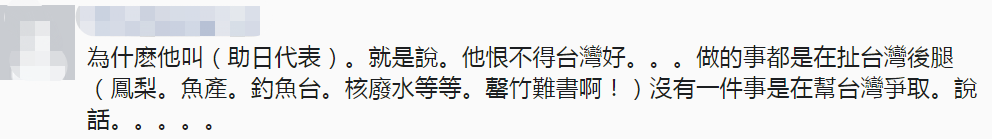 有網友解釋,為什麼他叫助日代表。就是説他恨不得台灣好,做的事都是在扯台灣後腿,菠蘿、魚產、釣魚台(即釣魚島)、核廢水等等,罄竹難書啊,沒有一件事是在幫台灣爭取、説話……↓
