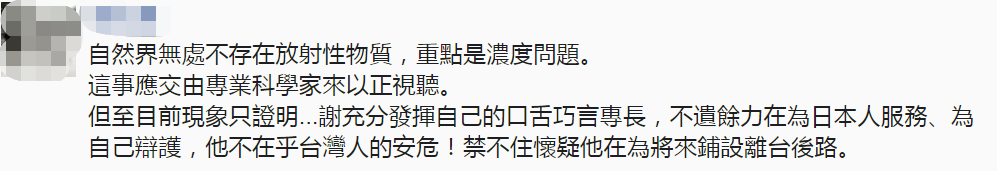 有網友解釋,自然界無處不存在放射性物質,重點是濃度問題。這事應交由專業科學家來以正視聽。但至目前現象只證明謝長廷充分發揮自己的口舌巧言專長,不遺餘力在為日本人服務、為自己辯護,他不在乎台灣人的安危!該網友懷疑他在為將來鋪設離台後路。↓