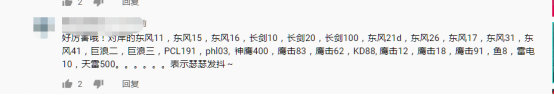 “好厲害哦!對岸的東風11,東風15,東風16,長劍10,長劍20,長劍100,東風21d,東風26,東風17,東風31,東風41,巨浪二,巨浪三,PCL191,phl03,神鷹400,鷹擊83,鷹擊62,KD88,鷹擊12,鷹擊18,鷹擊91,魚8,雷電10,天雷500……表示瑟瑟發抖”