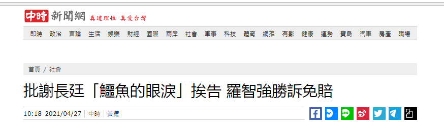 另據台灣聯合新聞網報道,謝長廷委任律師許惠峯曾聲稱,羅智強指謝長廷“逼死蘇啓誠”“會掉眼淚的鱷魚”屬於事實陳述,並非意見表達或合理評論,是不可承受之重,嚴重侵害名譽權。