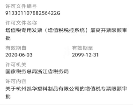 公開信息顯示,“杭州凱華塑料製品有限公司”截止到2019年末的實收資本為50萬元,員工社保繳納人數為27人,另據浙江省税務局在2020年6月發佈的許可文件,“杭州凱華塑料製品有限公司”在2020年6月3日才獲得增專票限額審批。