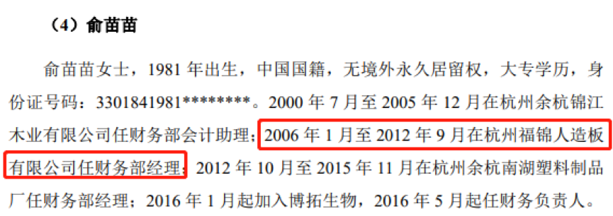 首先值得關注的是博拓生物高管人員職業履歷的真實性,根據招股書披露,俞苗苗是博拓生物的財務負責人,生於1981年、大專學歷,從2000年7月便在杭州餘杭鎮江木業任財務部會計助理,彼時俞苗苗年僅19週歲,請問這是否正常?不僅如此,俞苗苗在2006年1月至2012年9月擔任杭州福錦人造板有限公司財務部經理,但據公開信息顯示,這家公司在2012年5月便註銷了,俞苗苗還是清算組成員之一,俞苗苗怎麼可能截止到2012年9月仍然是這家公司的財務部經理?