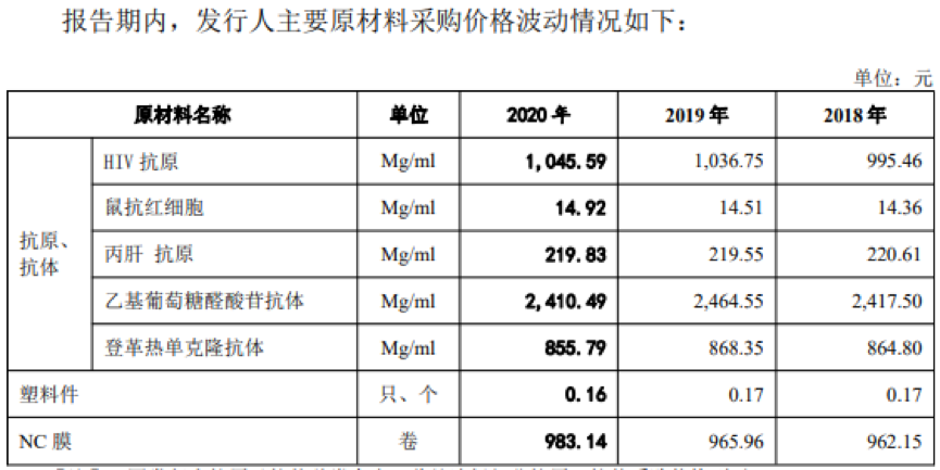 根據博拓生物披露的採購數據,該公司採購NC 膜單價在2020年為983.14元/卷,相比2019年的965.96/卷漲幅並不大;而根據安泰生物發佈的招股書顯示,該公司2018年和2019年採購NC膜單價分別為970.37元/卷和961.81元/卷、與博拓生物基本一致,但是2020年上半年採購單價則增加到1036.26元/卷,相比2019年漲幅較大且顯著高於博拓生物。