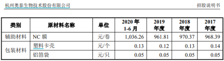 最後,根據招股書披露,奧泰生物是博拓生物的同行業可比公司,兩家公司採購的原材料中均包含NC膜,即硝酸纖維素膜,在膠體金試紙中用做 C/T 線的承載體,同時也是免疫反應的發生處,NC 膜是生物學試驗中最重要的耗材之一。