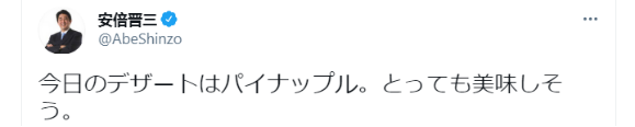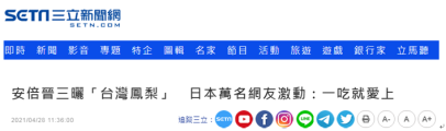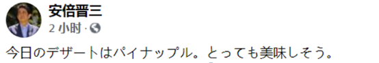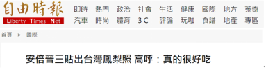 台灣《自由時報》、“三立新聞網”等多家綠媒今天(28日)都在炒作前日本首相安倍晉三上午在臉書及推特貼出與“台灣鳳梨”合照。安倍在帖文中還稱:“今天的甜點是鳳梨,看起來很好吃”。