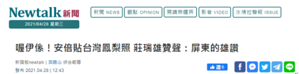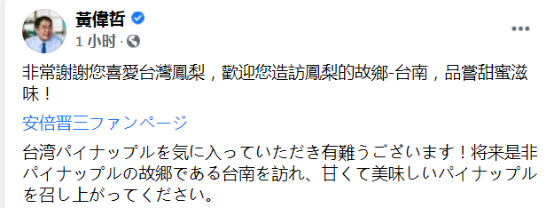 此外,民進黨屏東立委莊瑞雄也轉發安倍帖文聲稱,台灣鳳梨有多好吃,連安倍晉三都知道。