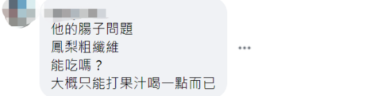 對於安倍在社交媒體發佈與台灣鳳梨合照,有島內網友想起了安倍因潰瘍性結腸炎復發而辭職的事,諷刺稱:他的腸子問題,鳳梨粗纖維,能吃嗎?大概只能打果汁喝一點而已。↓