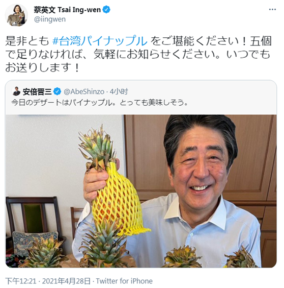 在安倍曬出照片後,台當局領導人蔡英文也跳出來轉發了安倍的推文,並用日文發推:請一定要享受台灣鳳梨!如果五個還不夠,請隨時告訴我。我會立刻送出!