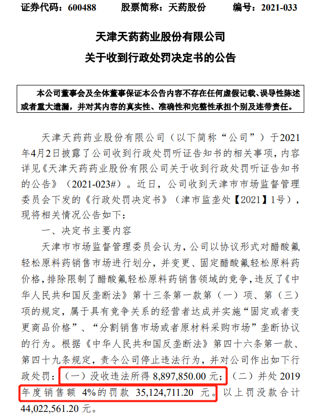 天津市市場監督管理委員會決定沒收天藥股份違法所得,並處2019年度銷售額4%罰款,共計4402.26萬元。