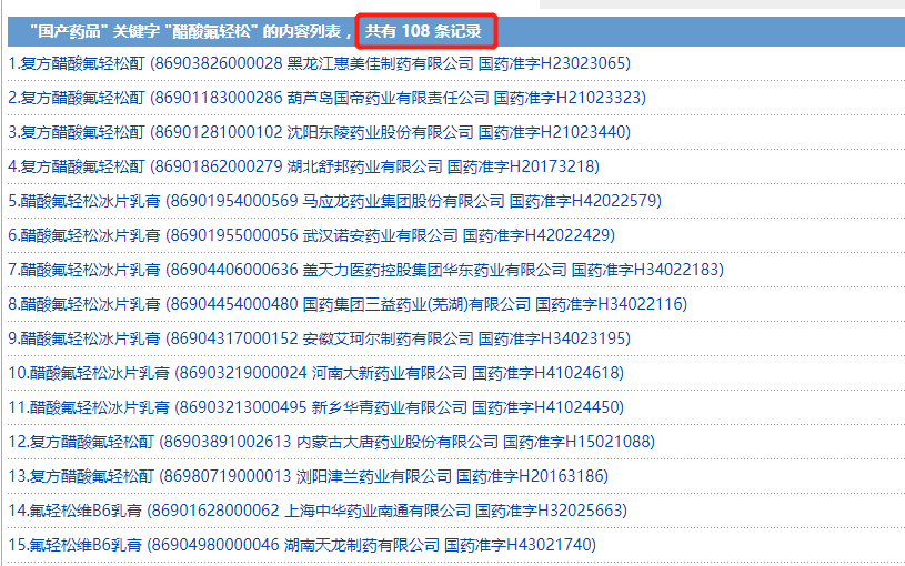 含有“醋酸氟輕鬆”原料的藥品包括複方醋酸氟輕鬆酊、醋酸氟輕鬆冰片乳膏、氟輕鬆維B6乳膏等。