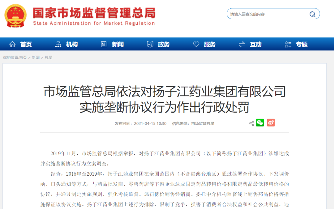 4月15日,國家市場監管總局公佈,依法對揚子江藥業集團有限公司(下簡稱揚子江藥業集團)實施壟斷協議行為作出行政處罰,處以7.64億元罰款。
