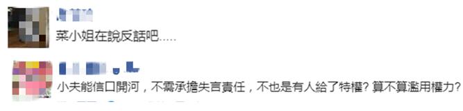 “蔡小姐在説反話吧……”有網友諷刺稱,“小夫(指台駐日代表謝長廷)能信口開河,不需承擔失言責任,不也是有人給了特權?算不算濫用權力?”