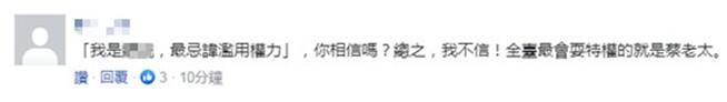不過,對於蔡英文的這番説辭,有島內網友“不信”,稱全台最會耍特權的就是蔡英文。
