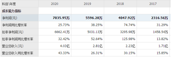 近幾年,正弦電氣產品銷售規模不斷擴大、盈利能力持續增強,企業利潤總額和淨利潤均呈增長趨勢。2018-2020年,公司營業收入分別為22,256.80 萬元、28,112.26 萬元和 40,292.51 萬元,淨利潤分別為 4,047.92萬元、5,596.28 萬元和 7,035.95 萬元,呈快速增長趨勢,2018 年-2020 年營業收入和淨利潤的年複合增長率分別為 34.55%和 31.93%,總體增幅基本一致。公司預計2021年1-3月營業收入區間為8,787.08萬元至9,712.04萬元,同比增長79.11%至97.96%;淨利潤區間為1,032.83萬元至1,141.55萬元,同比增長62.49%至79.59%。