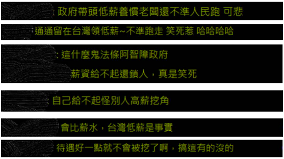 不過,對此,有島內網友在台灣PTT論壇留言批評,“政府帶頭低薪養慣老闆還不準人民跑,可悲”,“薪資給不起還鎖人,真是笑死”,“自己給不起怪別人高薪挖角”,“通通留在台灣領低薪,不準跑走,笑死惹,哈哈哈哈”,“待遇好一點就不會被挖了啊,搞這有的沒的”。↓