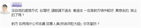 還有網友稱民進黨當局這是沒自信的處理方式。該網友質問,真想走的,禁止的了嗎?對方如用海外公司名義招募人員然後派駐大陸,你怎麼防?↓