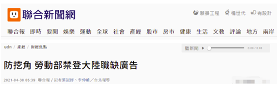 報道稱,台灣“勞動部”日前發函給人力銀行聲稱,近年受美中科技戰影響,大陸半導體產業積極挖角及滲透,建立自主供應鏈,台灣半導體研發人才成鎖定目標。“行政院”4月召開“研商防制人才挖角會議”,要求依“兩岸人民關係條例”第34條“未經許可之大陸地區勞務不得在台灣地區從事廣告活動”、第35條“從事台灣地區人民赴大陸地區就業之人力中介業務列為禁止項目”,要求業者將就業地點涉及大陸者先行下架。