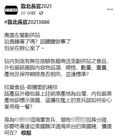 據聯合新聞網報道,疑為軍中官兵的網友3日在臉書粉絲專頁“靠北長官”上帖文爆料,稱高雄左營副供站供給某家食品廠供軍中的“御膳里肌豬排”,產品外箱包裝上註明原產地為台灣,內包裝原產地卻標示美國,“讓在艦上的官兵該如何安心享用每一餐?”