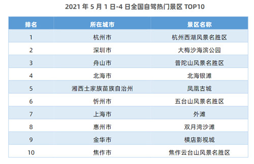 從全國各景區自駕熱度來看,杭州西湖風景名勝區自駕熱度最高,其次是深圳大梅沙海濱公園。另外舟山普陀山風景名勝區、北海銀灘、鳳凰古城、舞台上風景名勝區、外灘等也上榜“五一”十大自駕熱門景區。