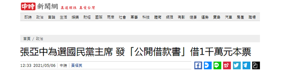 報道提及,張亞中5日上午在臉書發出“公開借款書”,懇請有財力的人士慷慨借他1000萬元(新台幣)本票,他若未當選主席就奉還,若當選主席也會在一年內募到1000萬元(新台幣)再奉還本票。