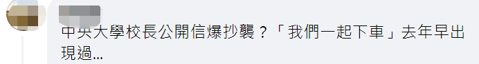網友留言諷刺“中央大學”校長公開信涉抄襲:“‘我們一起下車’去年早出現過”,“可以解釋為什麼師生信內容要抄襲嗎?一字不漏的抄襲,請問都不用附出處嗎?”“無才,裝啥文藝腔?”↓