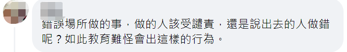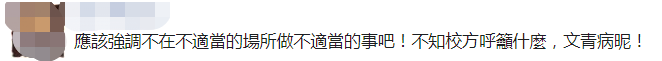 有網友問,在錯誤的場所做的事,做的人該受譴責,還是説出去的人做錯了呢?也有網友説,應該強調不在不適當的場所做不適當的事,該網友認為校方這是“文青病”。↓