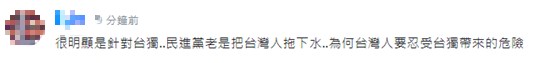 還有網友毫不客氣地説,“很明顯是針對‘台獨’..民進黨老是把台灣人拖下水..為何台灣人要忍受‘台獨’帶來的危險?”