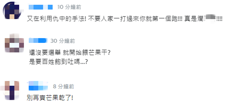 更有網友斥責民進黨當局“又在利用仇中的手法!”還有網友提到,“還沒要選舉,就開始喂芒果乾?”,有人呼籲他“別再賣芒果乾了!”