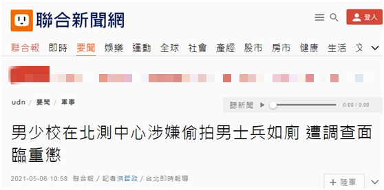 報道稱,有媒體接獲爆料,586旅在北測中心接受基地考核的某營部隊,4月底有官兵在男廁如廁時,發現被手機通過門縫偷拍,推門發現有一名少校同在男廁裏,因此向上級舉報,涉案者現在正接受調查,因該名少校無法清楚交代過程,也不肯交出個人手機,單位只好向上呈報陸軍第十軍團,法制官(指軍法軍官)隨即前往協處,共同調查。