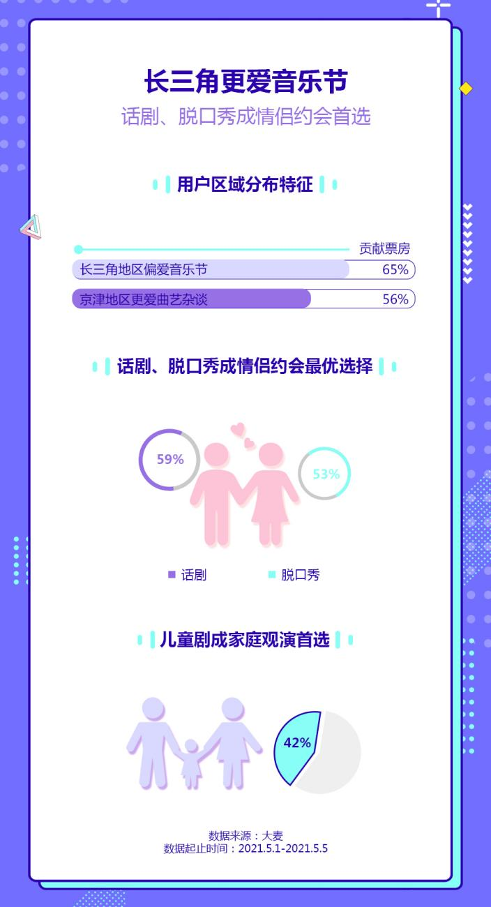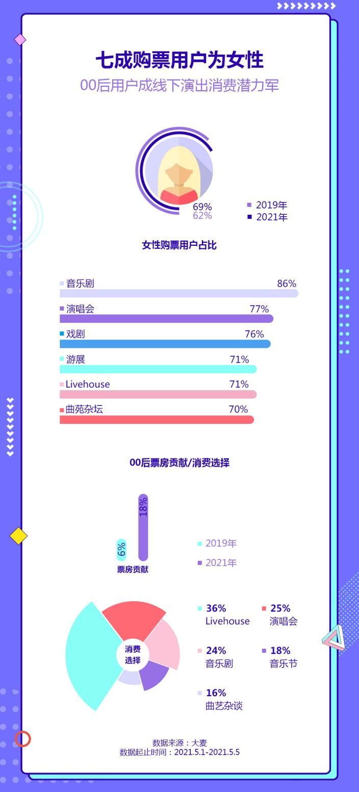“她經濟”時代,女性現場演出消費力明顯領先。今年五一小長假期間,線下演出女性消費較2019年穩步提升至69%。分品類來看,音樂劇最受女性用户的青睞,她們的消費佔比高達86%。遊展成女性消費新趨勢,消費佔比同比2019增加了21%。在演唱會品類中,生來知己《山河令》主題演唱會女性用户佔比為90%。此外,話劇、脱口秀成情侶約會最優選擇,情侶購票佔比分別為59%和53%;兒童劇成家庭觀演首選,佔比為42%。