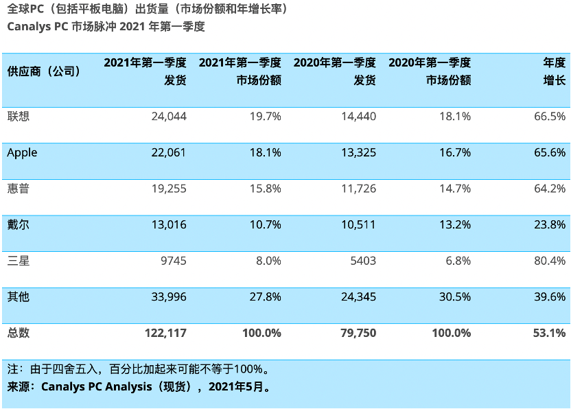 根據Canalys最新報告,2021年第一季度,聯想在PC(包括台式機、筆記本和平板電腦)銷售市場中的銷量處於領先地位,出貨量約為240萬台,高於蘋果、惠普、戴爾和三星。