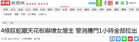 報道提到,有民眾在臉書貼文表示,感謝金山消防隊員,協助一場驚心動魄抓蛇行動。因為家裏後院天花板上藏了一尾大蟒蛇,糾纏近1小時,還是無法順利將該大蟒蛇拉出,纏鬥中又發現旁邊竟然還有3尾大蛇,體積相當龐大。