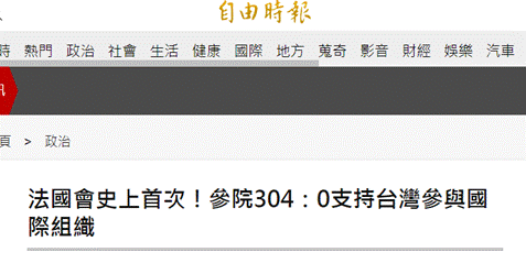 據台媒報道,法國參議院於6日傍晚召開會議,就“台灣參與國際組織工作”進行言詞辯論及表決等程序,最後“無異議”通過,正式成案。