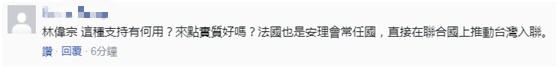 “這種支持有何用?來點實質好嗎?”有網友一針見血表示,“法國也是安理會常任國,直接在聯合國上推動台灣入聯。”