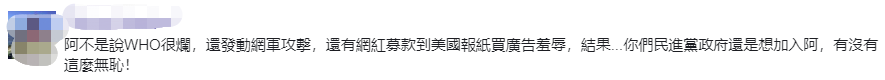 還有網友諷刺民進黨當局無恥:“不是説WHO很爛,還發動網軍攻擊,還有網紅募款到美國報紙買廣告羞辱,結果……你們民進黨‘政府’還是想加入,有沒有這麼無恥!”↓